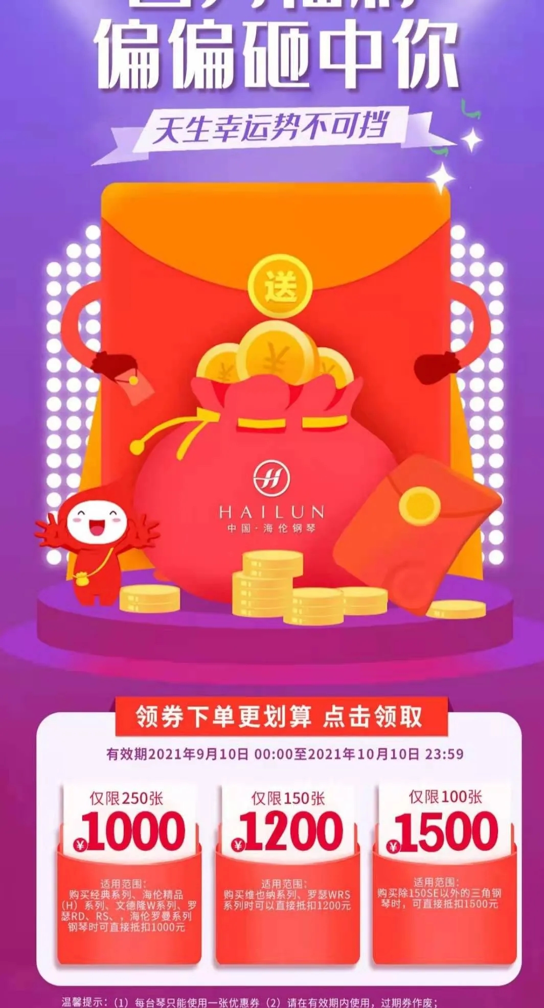 另外,活動還未結束,優(yōu)惠券就即將售罄,在中秋佳節(jié)來臨之際,為了不讓大家錯失福利,海倫鋼琴再次進行優(yōu)惠券補充,請大家抓緊時間領取并使用……