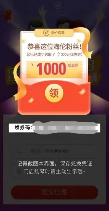答題成功,頁面將會跳轉至代金券領取界面,點擊您所需購買鋼琴對應的優(yōu)惠券金額,進入信息填寫界面。