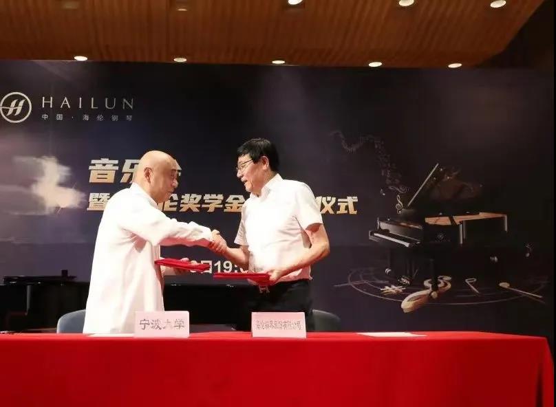 寧波大學(xué)音樂(lè)學(xué)院俞子正先生與海倫鋼琴股份有限公司董事長(zhǎng)陳海倫先生簽訂捐贈(zèng)協(xié)議,由寧波大學(xué)副校長(zhǎng)趙全軍先生向海倫鋼琴股份有限公司董事長(zhǎng)陳海倫先生頒發(fā)捐贈(zèng)證書(shū)。