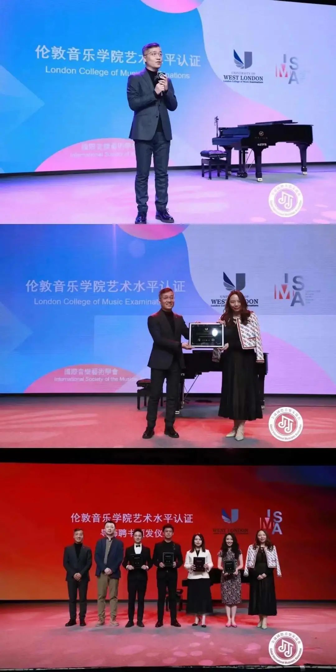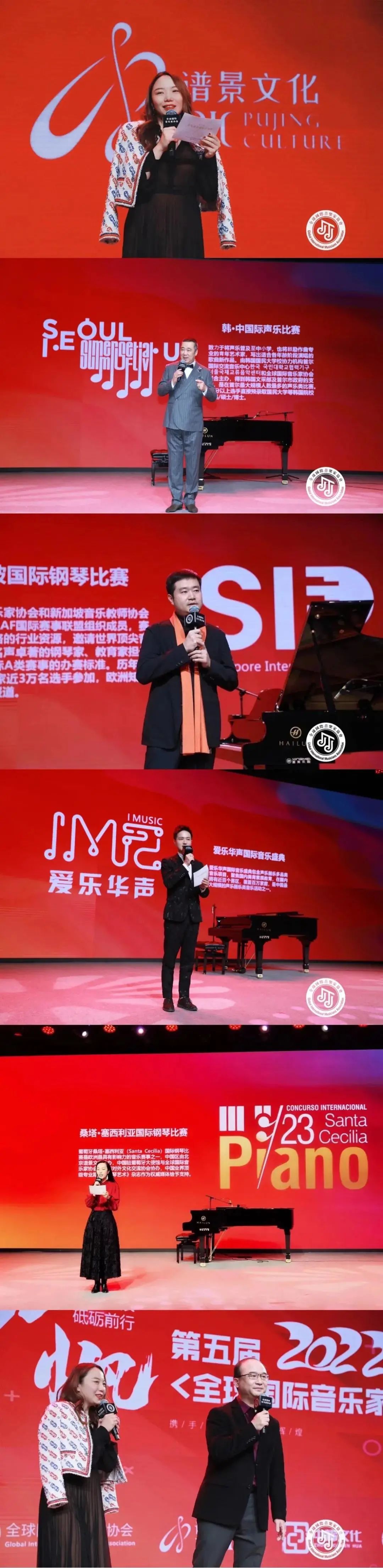 全球國際音樂家協(xié)會會長張一玫女士,韓·中國際聲樂比賽藝術(shù)總監(jiān)——中央戲劇學(xué)院歌劇系教授孫健先生,新加坡國際鋼琴比賽藝術(shù)總監(jiān)——天津茱莉亞學(xué)院預(yù)科鋼琴學(xué)科主任王笑寒先生,倫敦音樂學(xué)院LCME中國代表處梁崴先生,全球國際音樂家協(xié)會常務(wù)理事周慶頤先生,全球國際音樂家協(xié)會常務(wù)理事肖瀟女士向所有到場嘉賓發(fā)布了2022年全球國際音樂家協(xié)會所主辦的各項活動。