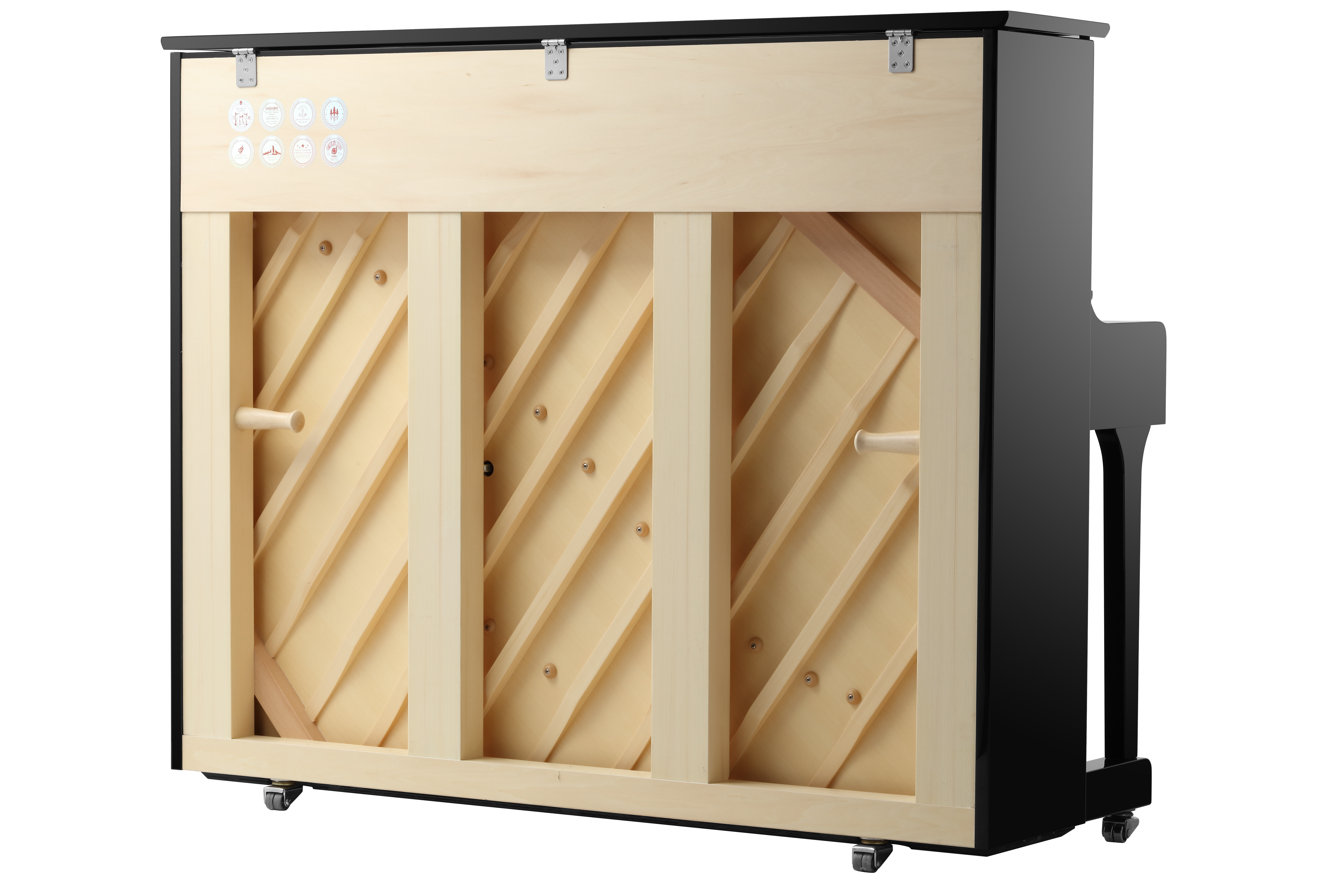 鋼琴的背柱、肋木等木質(zhì)部件,均選用產(chǎn)于較寒冷地區(qū)的多種優(yōu)質(zhì)木材精細(xì)加工而成,其中背柱上下梁及斜框采用高硬度實(shí)木,確保背架長久耐用,保證鋼琴在琴弦的巨大張力(約17噸)作用下依然恒久穩(wěn)定。