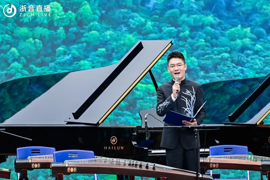 音樂會由詩朗誦《天目山:浮玉的歌唱》,以及浙音翡翠箏團帶來的古箏合奏《夢回臨安》《英雄贊歌》《綠風》暖場開幕。典雅精妙的樂曲中,既有“陌上花開緩緩歸”的雋雅秀美,又有“烽煙滾滾唱英雄”的慷慨激昂,現場觀眾們瞬間被帶入一場綺麗的水鄉故夢中,在音樂中遍覽繁花似錦、璀璨明亮的錦繡山河。
